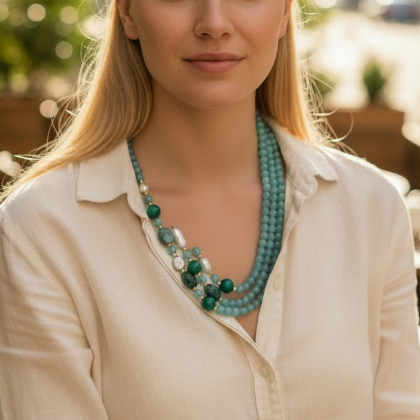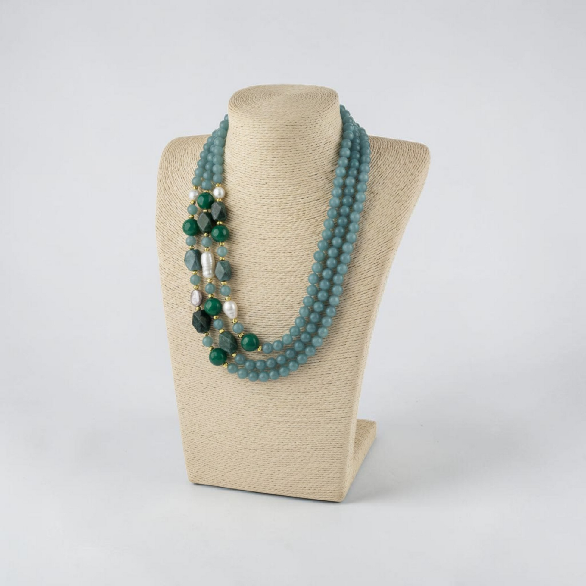 Collana 2 fili in Calcedonio e Quarzo Verde