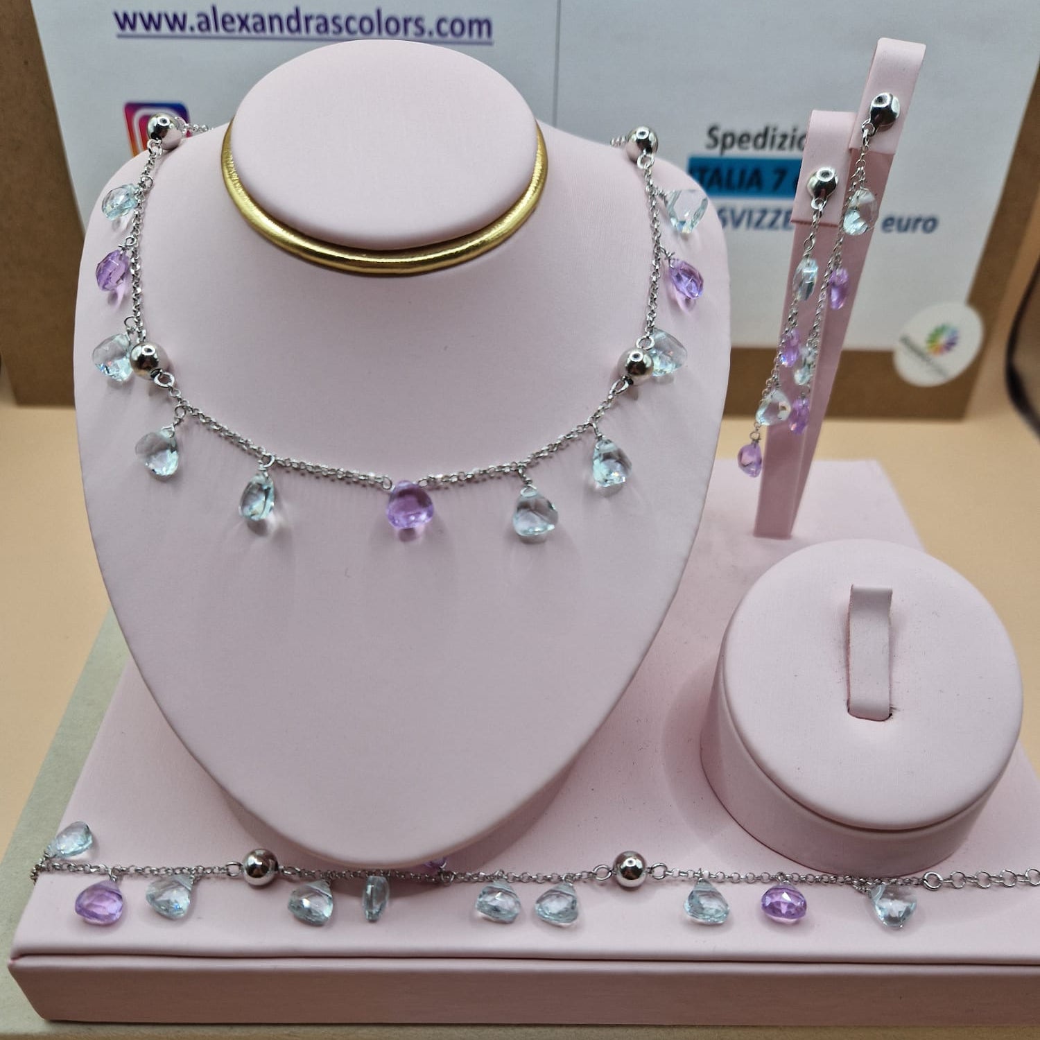 Collana Gocce Lilla e Acquamarina, Argento s925