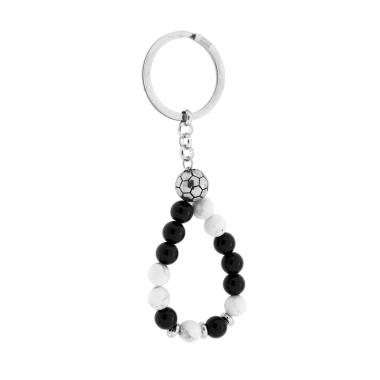 Portachiavi ad anello con accessori pallone da calcio e filo di pietre bianche e nere alternate pendenti.