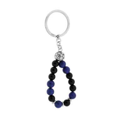 Portachiavi ad anello con accessori pallone da calcio e filo di pietre blu e nere alternate pendenti.