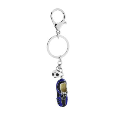 Portachiavi ad anello e gancio pappagallo con accessori pendenti pallone da calcio con smalto bianco e scarpetta da calcio con applicazione smalto blu e nero.